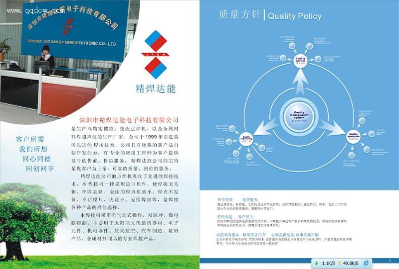 精焊达能公司是专业生产储能、交流点焊机,以及金属材 料焊超声波的生产厂家。公司于 1999 年引进美国先进的 焊接技术,公司具有较强的新产品自制研发能力,有 专业的应用工程师为客户提供及时的售前、售后服务。 精焊达能公司的宗旨是视客户为上帝,可靠的质量、到位的服务。