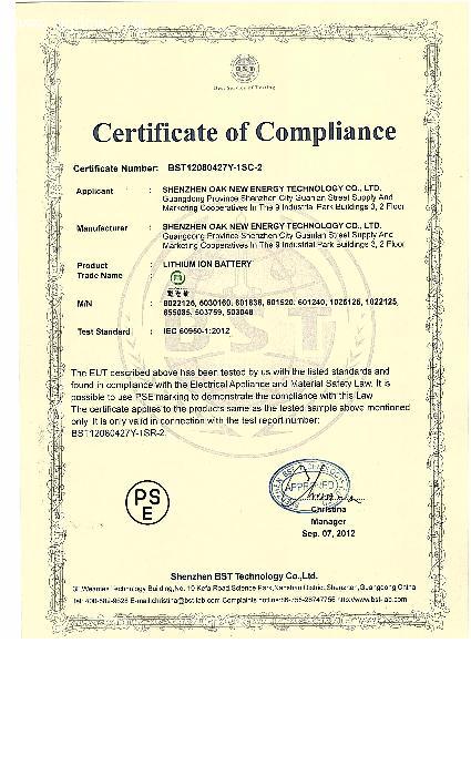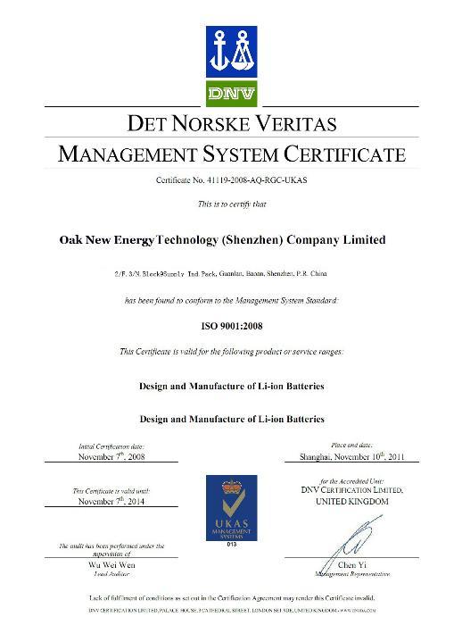 公司先后通过了ISO9000、QS9000、ISO14000和OHSA18001管理体系认证,产品通过了美国UL认证、德国TUV、ROHS、CE、UN38.3、MSDS,日本PSE等认证,有利地保证了产品从设计、制造、服务等方面均达到国际同类产品先进水平。