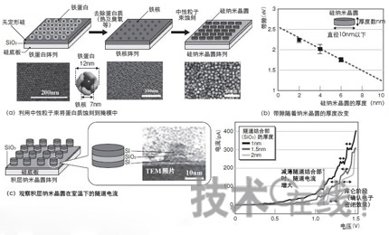 图5:通过蚀刻形成量子点将蛋白质蚀刻到掩模上形成了量子点。还确认了隧道电流。照片由东北大学提供。图是《日经微器件》根据东北大学的资料制成。(点击放大)
