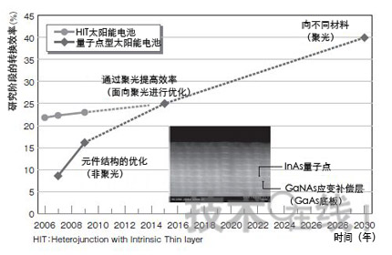 图6:2015年以后将超过结晶硅中间能带方式的量子点型,转换效率逐渐提高。预计2030年达到40%。照片由东京大学提供。图为《日经微器件》根据东京大学的资料制成。