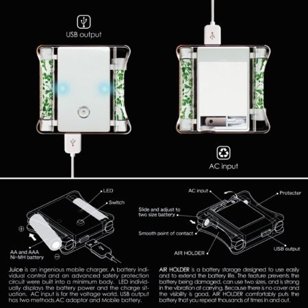 这款充电器有两个接口,可以通过普通电源或是USB接口给充电电池补充电量。也正因为有了USB充电接口,它还能给各种电子设备补充电量。而放置充电电池的凹槽也可以进行调整,能够为5号和7号电池充电。