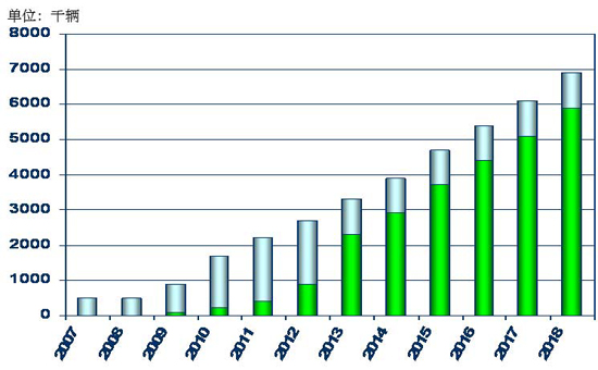 图1:全球混合动力汽车(HEV)、充电式混合动力电动汽车(PHEV)、纯电动汽车(EV)市场规模