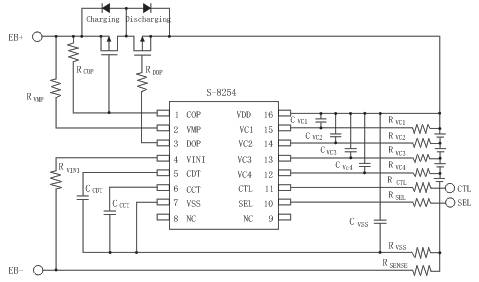 图1是以精工S-8254A为保护IC的4串应用原理图。S-8254 系列内置高精度电压检测电路和延迟电路,是用于3节或4节串联锂离子或者锂聚合物可充电电池保护的IC。通过SEL端子的切换,可用来保护3节或4节串联电池。