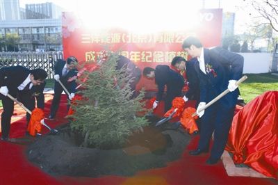 11月9日,三洋能源(北京)有限公司厂区内,董事长后藤胜城与总经理林佳彦一起揭开了标有“公司成立十周年,纪念植树”的石牌,各分公司经理参加植树仪式一起挥锹铲土种下了一株常青树,拉开了三洋能源(北京)有限公司庆典的序幕。