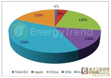 根据集邦科技预估,2011年全球市场的安装量在15.5GW (中性)至20GW (乐观)之间,而全球太阳能电池产能在2011年将到达年成长25GW~30GW的水准,使得市场上存在供过于求的杂音。而展望各市场的状况,与 2010年的安装量相比,欧洲市场呈现微幅下跌,而中国、日本、美国等市场则呈现上扬的状况,因此在总安装量上呈现温和成长。