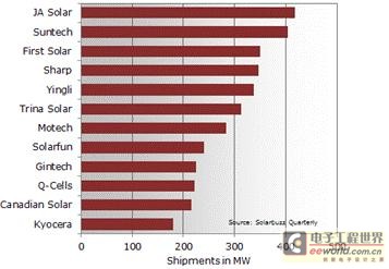 在这些厂商中,排名首位的是来自中国的晶澳太阳能(JA Solar),出货量占全球8%;紧追在后的二、三名厂商分别为尚德(Suntech Power)和First Solar。