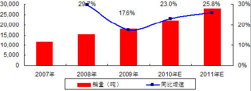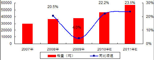 图 2 2007-2009年中国正极材料销量及增速