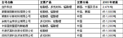 国内钴酸锂市场从结构来看,2002年是一个分水岭。2002年以前,国内市场主要由日本SEIMI和比利时联合矿业集团(UM)等少数国外企业占据着。2002 年,以中信国安盟固利,北京当升为代表的国产材料生产商以较优的产品性价比,从国外厂商处夺得大量市场份额,中国锂电的龙头企业比亚迪在香港的成功上市后,转成部分自产钴酸锂。目前,国产正极材料占比已达到90%以上。从目前的情况来看,当升材料2009年全球钴酸锂市场份额为10.4%,其市场地位处于国内第一,全球第三。国内以钴酸锂为正极材料的锂电池生产厂家主要有:天津力神、深圳比克、邦凯、华粤宝、武汉力兴等。