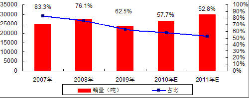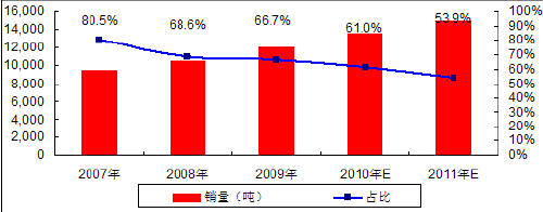 图 6 2007-2009年中国锰酸锂销量及占全部正极材料比例