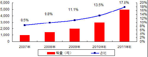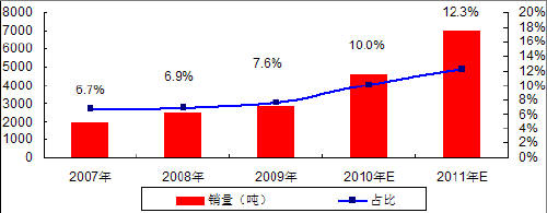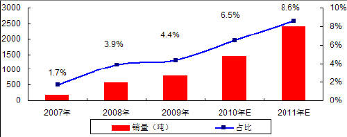 图 7 2007-2009年全球磷酸铁锂销量及占全部正极材料比例