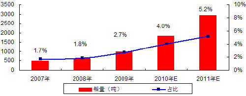 2009年全球锰酸锂销量达到2850吨,占全部正极材料销量总额的7.6%,随着锂离子电池对正极材料需求的扩大,再加上锰酸锂相比钴酸锂的各种优势,赛迪顾问认为全球锰酸锂销量在2010年将在2009年的基础上出现大幅度的增长,达到4600吨左右,占全部正极材料的比重也将提升到10%。
