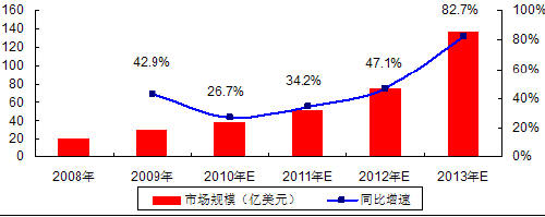 赛迪顾问预计,由于受到新能源汽车的影响,2012年全球锂离子电池的市场规模将达到250亿美元,按照锂离子电池隔膜占30%计算,其市场规模将达到75亿美元。未来几年市场规模的增长速度也将呈现出逐年递增的趋势。