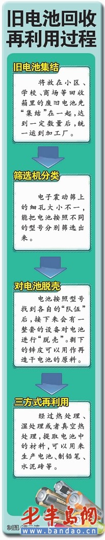 钟表、电动玩具、遥控器……老百姓用电池的机会越来越多。可大量废旧电池该往何处去呢?据记者调查发现,青岛市的废旧电池回收箱数量很少,而且大多“吃不饱”。而青岛市唯一一家专门回收利用公司三年才收集到足够的电池 ,统一运往铁岭一家公司进行再利用处理。在那里,废旧电池全身都是“宝”,可以用于再造新电池、制铅笔、化肥、水泥砖等。