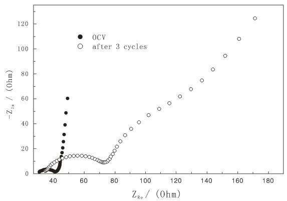 图4为 LiNiVO4电极在开路状态下和CV测试三个循环后的EIS图。LiNiVO4电极在开路状态下的EIS图形由一个高频区的半圆和一条低频区的直线组成。其中,高频区的半圆与电极和电解液表面之间的电荷转移步骤有关,而低频区的直线则反映了锂离子在固态电极中的扩散情况。经过三次循环后,EIS图发生了变化,由高频和中频区的两个半圆环以及低频区的扩散直线组成。一般来说,第一个半圆代表电极表面SEI膜中的离子传导,第二个半圆代表电子在电极活性物质中的扩散,低频直线表示的是Li+离子在固相中的扩散。显然,经过循环后LiNiVO4电极的电化学反应阻抗增大,说明进行电化学反应变得比较困难。而当LiNiVO4在高电压下进行脱嵌锂时,会发生溶剂和电解质电极表面还原进而生成钝化膜,反复循环可能导致SEI膜厚度增加从而使其阻抗增大。