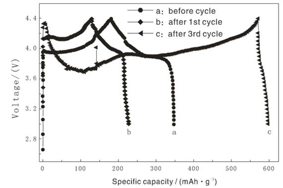 许多研究者都将LiNiVO4较差的电化学性能归因于在高电压下电解液发生了分解,为了验证这一情况,我们将经过CV测试的三电极模拟电池放入手套箱中,取出其中的LiPF6电解液和新鲜的LiPF6电解液分别与商品化的LiCoO2正极材料组装扣式电池进充放电测试。图7给出了商品化的LiCoO2于30 mAg–1下、4.4-3 V范围内在不同的LiPF6电解液中的首次充放电曲线。从图上可以看出,LiCoO2在新鲜的LiPF6电解液中首次充放电容量分别为181.5和166.1 mAhg–1;在经历了一次CV实验的LiPF6电解液中,LiCoO2的首次充放电容量仅为129.8和98.1 mAhg–1,并且充电平台升高,这极有可能暗示着电解液此时已经发生了分解;为了进一步说明这一问题,我们采用经历了三次CV扫描的LiPF6电解液进行同样的实验,发现LiCoO2的充放电曲线已变得畸形,放电容量仅为26.5 mAhg–1,这充分说明此时电解液已经基本丧失了离子传导功能。