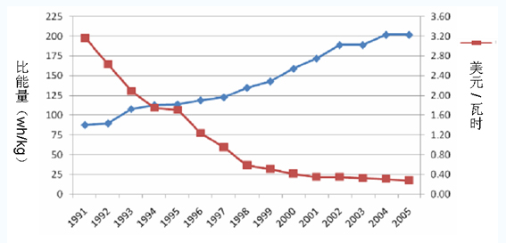 图1:1991-2005年车用锂电池能量密度提升和成本下降情况