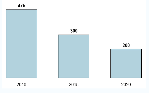 图2:罗兰贝格对未来5年、10年的锂电池单元的成本(欧元、每千瓦时)预测
