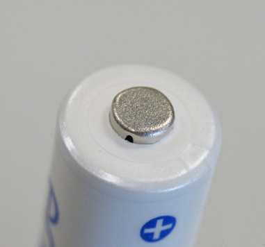 eneloop的正极是白色的端盖。正极触点是三洋特有的方圆形。触点的金属面是磨砂面。正极侧面均匀的分布了四个小气孔。以上三点是最容易辨认的,如果是假eneloop电池不会做到这么精致。