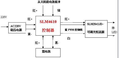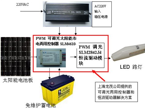 这种控制器在平时采用太阳能电池板向蓄电池充电,晚上由蓄电池放电给LED路灯,而且还可以根据当地交通流量的统计值来调节LED的亮度,一旦检测到蓄电池的电压不够放电(低于最低允许放电电压),就自动切换到市电,通过一个大功率开关型稳压电源,来取代蓄电池向可调光恒流模块供电。
