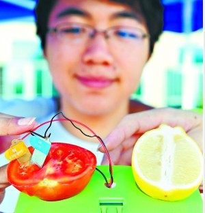 原来,梨、苹果、橙子、柠檬等水果里含有酸性离子,凡是酸性水果都能发电。两种电化学活性不一样的金属片,其中金属特性更活泼的金属片能将水果中的酸性物质置换出氢离子,产生正电荷,从而形成电流。学生解释说,“电流大小和水果中酸性物质的浓度成正比,柠檬发的电最强,提子发的电就很微弱。”