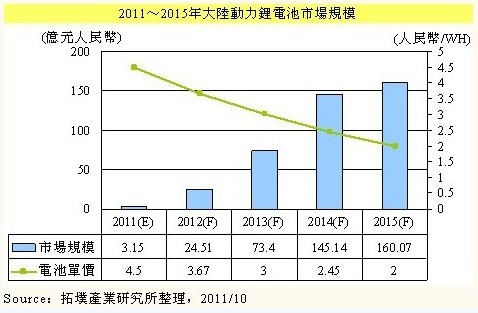 据外媒报道,拓墣产业研究所预测,2015年,中国大陆动力锂电池市场规模将达160亿元人民币,届时电池单价将降至2元/WH。