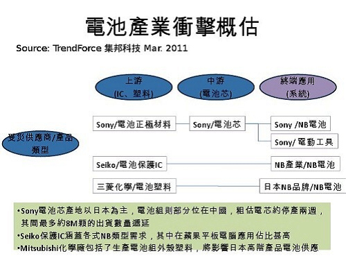 对于电池产业来说,无论上游至终端,都有所影响,从最上游原料来看,包括了三菱化学以及Seiko都在名单当中,三菱化学所生产的电池正极粉体,主要仍以 NB为大宗,使用终端以日本NB产品为主;Seiko生产电池保护IC,几家NB品牌厂都有所采用,尤其在Apple新款平板计算机的应用更是独占,后续补料状况 将值得观察。