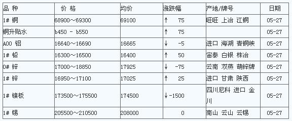 2011年5月27日长江有色金属现货下午快讯(铜铝铅锌锡镍)