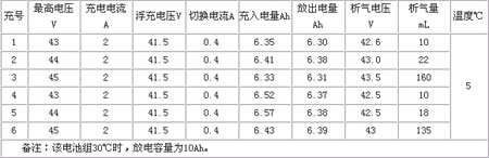 试验时间是在冬季,水温5℃。实验条件是统一用2A电流充电,最充电电压分别用43V、44V、45V轮循环依次进行,浮充转换电流一律400mA,记录下每次的充电时间,包括充电末期随时间电流下降各点数据、开始析气电压,按时间记录析气量。电池充完后,用万分之几精度的电量台记录放电容量。充入电量是在计算纸上读出时间电流曲线与坐标之间的面积(电容量就是充电电流对时间的定积分)。