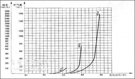 从上图表可以看出,电池在42.5V~43.5V时开始析气,而析气的速度与充电电压有关。到充电结束时,总析气量与充电最高电压有关,43V与45V总析气量相差10位(注:以单格允许极限失水10克,18格相当240公升气体,该电池45V时失水并不大)。在充电末期电流下降区时,只要降低电压到42.5V时,析气立即停止,这时充电电流稍小一点,还会依着原来的规律下降。