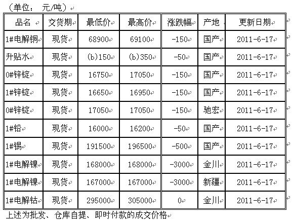 - 2011年6月17日长江有色金属现货上午快讯(铜铝铅锌锡镍)