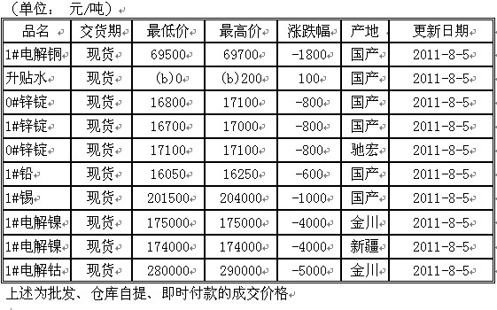 2011年8月4日广东有色现货报价(南储)(铜铝铅锌镍钴镉锰镁铋)