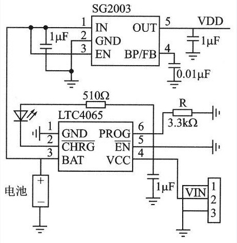 LTC4065的电压输入端VCC所允许的输入电压在3.75~5.5 V之问。目前市场上的5 V稳压电源的输出电压一般并不稳定,很多时候会超过6 V而给充电带来不良影响。LTC4065内部具有稳压电路能够起到一定的稳压作用,一般应用情况下可直接连接稳压电源。如果应用需求较高,也可在VCC的前级加一个1 A的三端稳压电源芯片。在图2所示电路中,将VCC直接接至稳压电源,锂电池通过一个线性稳压芯片SG2003为工作电路提供电源。