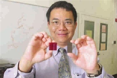 ■杨阳教授展示红色太阳能电池薄膜(左)和传统的硅晶太阳能电池板" target="_blank">太阳能电池板(右)