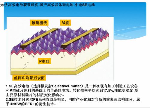 SE高效电池(选择极发射SelectiveEmitter)是一种在现有加工制造工艺设备和P型硅片原料的基础上的单晶硅电池。其转化效率平均达到17.5%,性能更稳定,受主要原材料硅片的材质变化影响小。
