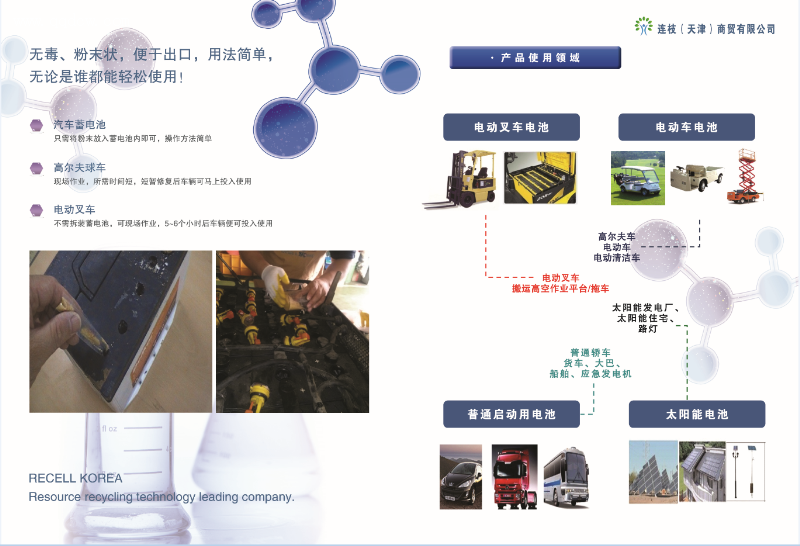 韩国铅酸蓄电池修复原料产品,利用化学原料修复铅酸蓄电池,操作简便无需反复充放电只需往已筛选好的蓄电池中加入定量的粉末后100%充电后即可完成修复,并使其蓄电池可以再次如新电池一样可用。原理是将导致电池性能下降的主要成份硫酸铅还原为硫酸离子,恢复电池内的硫酸浓度,使已使用过的铅板再与硫酸发生反应。