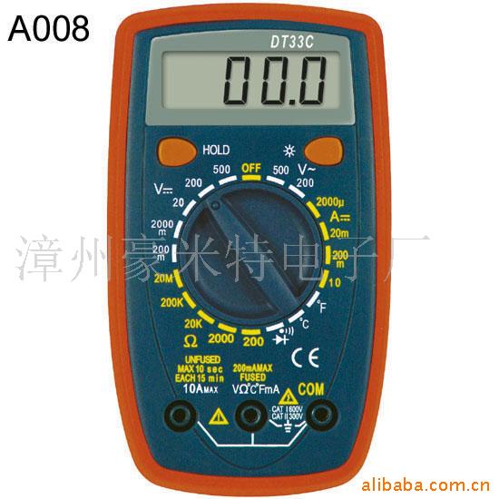 ·3 1/2 数字液晶屏,最大显示值1999·温度测量·数据保持·低电压符号显示·通断测试·背光显示·直流电压测量输入电阻约10MΩ------------------------------------------------------[功能]--------[量程]--------[准确度]直流电压: 200mV-500V 【±(0.5%+2dgt)】交流电压: 200V-500V 【±(1.2%+10dgt)】直流电流: 2000µA-10A 【±(1.0%+2dgt)】-- 电 阻: 200Ω-20MΩ 【±(0.8%+2dgt)】-- 温 度: °C/°F 【±(3.0%+2dgt)】二 极 管: 有 电源供应: 9V电池(6F22) 最大显示: 1999 外形尺寸: 130×73.5×35mm -- 重 量: 156g 标准附件: 表笔、电池、说明书、保修卡