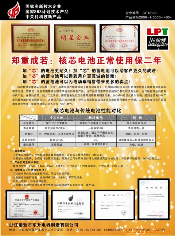 我公司是一家专业生产铅酸蓄电池及蓄电池极板的企业。公司新推出一款“拉帕特”牌核芯晶胶铅酸蓄电池,核芯蓄电池在原有蓄电池的基础上添加高科技的平衡模块和进口晶胶等原材料组成,主要起到电池单只不落后、不过充、不失水、抗低温、延长电池使用寿命等功效,大大节约客户使用成本。我公司承诺,“拉帕特核芯晶胶铅酸蓄电池,保用两年”。