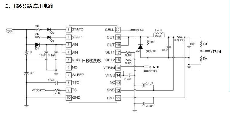 HB6298开关型单/两节锂电充电管理芯片 概 述 HB6298A为开关型单节或两节锂离子/锂聚合物电池充电管理芯片,非常适合于便携式设备的充电管理应用。HB6298A集内置功率MOSFET、高精度电压和电流调节器、预充、充电状态指示和充电截止等功能于一体,采用TSSOP20封装。HB6298A对电池充电分为三个阶段:预充(Pre-charge)、恒流(CC/Constant Current)、恒压(CV/Constant Voltage)过程,恒流充电电流通过外部电阻决定,最大为1500mA。HT6298A 集成Cycle-by-Cycle电流限制、短路保护,确保充电芯片安全工作。HB6298A集成NTC热敏电阻接口,可以采集、处理电池的温度信息,保证充电电池的安全工作温度。 特 性 ● 适用于单节或两节锂离子/锂聚合物高效率充电器的设计 ● 内置功率MOSFET ● 软启动 ● 较高的开关频率500KHz ● 0.5%的充电电压精度 ● 可编程最大充电电流控制,最高达1500mA ● 高端电池电流检测 ● 防反相保护电路可防止电池电流倒灌 ● NTC 热敏接口监测电池温度 ● 有无电池检测 ● LED充电状态指示 ● 恒压充电电压值可通过外接电阻微调 ● Cycle-by-Cycle电流限制,电池短路检测、保护 ● 边充边放功能 ● 输入电压范围4.5V~18V ● 工作环境温度范围:-30℃~70℃ 应 用 ● 手持设备,包括医疗手持设备 ● Portable-DVD,PDA,移动蜂窝电话及智能手机 ● 移动仪器 ● 自充电电池组 ● 独立充电器