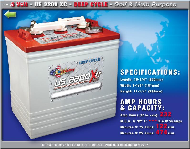 美国U.S. 电池公司从1926年开始产造铅酸深循环电池, 是美国电池制造业著名的领导者。它一直致力制造及研发耐用及持久的高质素电池, 更历史性引入 "XC" 超能量技术, 全面提升电池的效能。时至今日, 美国U.S. 电池公司已成为主导制造深循环电池的生产商, 特别应用于高尔夫球车、清扫机、升降台、航运设备及一些特别机械。美国U.S. 电池公司在美国现有三间庞大及现代化的厂房, 其产品销售网络遍及全球。 U.S. Battery深循环铅酸工业电池,因采用"XC" 超能量科技强化了极板结构,使其六项性能得到提升: 1. 更大的初始容量:利用附加的隔板贴膜,有序地控制硫酸铅晶体的尺寸和转换效率,从而使电池正极板具有更大的初始容量 2. 更高的峰值能力:有序的硫酸铅晶体控制同时也带来更优的正极板晶体孔隙度和更大的表面积,使正极板具有更高的峰值能力 3. 更大的能量密度:由于电池的尺寸和重量并没有增加,更高的能量转换意味着电池具有更大的能量密度; 4. 更强的充电能力:拥有更多均衡的晶体结构的正极板使电池的充电能力更强,特别是在低温和多变的充电环境; 5. 更稳固的隔板结构:在正极板间活动物质中具有更均衡的晶体,便于形成了一个更强的晶体网格,从而减低了电池在振动和撞击中的晶体脱落; 6.更长的循环寿命:更强的晶体网格同样也降低了电池深循环中晶体的脱落,保障了电池的循环寿命。 US电池先进的技术特征: 1. 钻石隔板技术: 先进的粘贴模式最大化了电池的容量和充电能力。 2. 新电极板合金(AntiniumTM): 有效减慢电池内部的 "电板极内腐蚀" 和水的用量问题,大大延长电池寿命达15-20%。 3. 晶体锁技术: 先进的隔板固化工艺确保了整体结构的强度,确保了固体吸附于网格之上,从而优化了电池循环寿命。 4. 速度帽技术:保证了在移动电池时,不会造成某个正极帽的脱落或酸液的溅出。一体化的设计,方便同时取除三个极帽,从而节约了时间和费用。 5. 更厚的隔板: 采用比同业更厚的隔板,确保更长的电池循环寿命。 6. 额外的电解质: 采用更短,更厚的隔板让更多的电解液盖过隔板,从而延长了电池加水的时间间隔。 7. 起重手柄: 保障了电池安装和移动的快速,简便和安全。 US2000XC,US2200XC,US8VGCXC,US12VXC,US185XC,US27DCXC,US31DCXC,L16HCXC,US305HCXC,US145XC,L16XC,US185HCXC,US1800XC,US125XC,