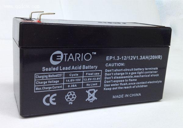 额定电压:12V额定容量(20hr):1.3Ah外形尺寸:长:97mm 宽:43mm 高:53mm参考重量:560g不同放电率实际容量20小时率:1.2Ah10小时率:1.1Ah5小时率:1.02Ah1小时率:0.72Ah容量与温度的关系(20小时率)40℃(104℉):103%25℃(77℉):100%0℃(32℉):86%-15℃(5℉):65%在25℃(77℉)时完全充电的内阻:约45mΩ充电方法(恒压)循环:最大充电电流为360mA充电电压14.4-15/12V77℉(25℃)充电温度补偿电压 -15mV/℃浮充:最大充电电流为360mA充电电压13.6-13.8V/12V77℉(25℃)充电温度补偿电压 -10mV/℃