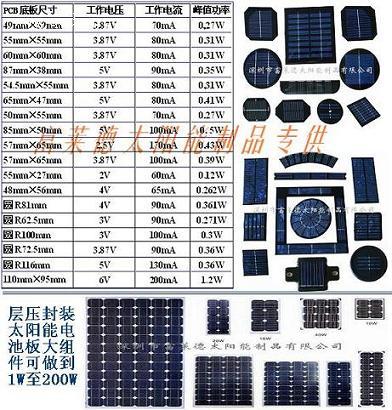 您好!我们专业生产供应各种单晶硅/多晶硅/非晶硅三种类太阳能电池板.产品主要用于利用太阳光照射充电\发电,应用于各式各样带蓄电池或小功率电机电子产品开发创新.为现代化理念产品,受各商家十分创爱! 该产品太阳能电池板广泛配套于太阳能灯具、玩具、教学用品、充电器、电子礼品、手机、电器、POLY工艺品及计算器等等电子产品所用!欢迎新旧商友来函、致电或亲临敝公司洽谈合作!如下的小部分环氧树脂封装或PET封装太阳能板规格供参考!我们可以根据您的需要制作。规格尺寸 开路电压 工作电流 峰值功率 61mm×19mm 3V 40mA 0.12W 35mm×35mm 3.5V 40mA 0.141W 59mm×47mm 5V 70mA 0.35W 65mm×47mm 5V 60mA 0.3W 49mm×59mm 4V 70mA 0.28W 55mm×55mm 3.87V 80mA 0.31W 60mm×60mm 3.87V 90mA 0.35W 70 mm×70 mm 5.5V 100mA 0.55W 55mm×27mm 2V 60mA 0.12W 53mm×18.5mm 1V 80mA 0.08W 105mm×85mm 6V 120mA 0.72W 圆R62.5mm 2.5V 170mA 0.43W 圆R81.3mm 3.87V 100mA 0.39W 圆R100mm 6V 100mA 0.6W 圆R107mm 6.5V 130mA 0.85W 各种太阳能板订做自选可做电压范围0.5V至72V。电流范围0.01A至20A(钢化玻璃带铝合金框太阳能板可做1W—280W单/多晶组件!)真诚寻求合作商家!!本产品为订做价格另起商定!详情欢迎来电与我司询问洽谈!