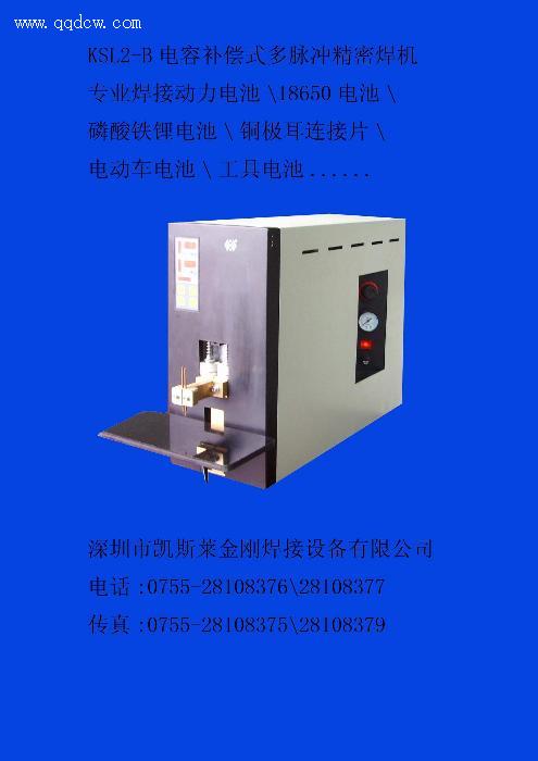 性能特点 KSL2-B电容式微电脑双脉冲精密点焊机采用精确的数字控制,能预存10个程序,并可随意更改、调用;运用电容储能式,放稳定,电压自动补充,确保焊接牢固、焊点美观;数码显示各组焊接参数,本焊接设备采用气缸控制,工作台无级升降手拧式锁紧,电极立体式调节,使操作者可以轻易地焊接各种形状、尺寸的材质。KSL2-B电容式双脉冲精密点焊机配有一组大功率超级电容器,对焊接放电更加稳定,还对电网电压自动监测、跟踪补偿。 适用焊接 锂离子电池(组)、镍氢电池(组)、镍镉电池(组)、纽扣电池。 主要电气参数 输入电压 220V/50Hz(60Hz) 输入电流 30A 输入气源 压缩空气气压不大于10Bar 输出电压 3.2V 输出功率 8KVA 输出瞬间电流 2000A 放电时间 最长16ms 焊接次数 约260次/分 焊接控制 电容式 预焊脉冲数(最大) 0-3波 焊接脉冲数(最大) 0-3波 焊接能量调节 0-999 自动焊接补偿率 +40v、-50v 二级加压时间 0.秒*10 数位显示 7位数码管*3 数比显示 9级显示格 主控电脑 8BIT微电控 数位记忆 E.EPROM 精密控制 抗干扰补充电压 加压时间 0.01-0.99秒 第一个脉冲数 0-3 第一个脉冲能量调节 0-999 第二个脉冲数 0-3 中间冷却时间 0.01-0.99秒 第二个脉冲数量调节 0-999 后加压时间 0.01-0.99秒