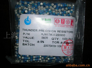 贴片色环电阻 RJM, RGM,RFM 这种电阻也叫晶圆电阻,无引线电阻,超高精密,超低温度,散热性好,体积小是这种电阻的最大优点,可以替代传统的插件电阻,在工作环境恶劣的情况下使用这种电阻,可以起到良好的作用 阻值范围:0.1R—10MR 公差:+-0.02%,0.05%,0.1%,0.25%,0.5%,1% 低温度系数:(TCR): 5,10,15,25,50PPM 规格:0204 L=3.45mm,D=1.3mm 207 L=.7mm,D=2.1mm 0411 L=8.7mm D=3.1mm 0618 L=11.8mm d=3.6mm 功率:0.25W,0.35W,0.5W,1W,2w,3w 应用:仪器仪表,汽车,LCD,电源等