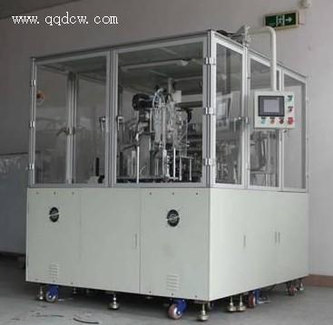 此设备是使用机械臂左右运动时在两极限位拾取极片料中间位交替放料叠片同时在左右运动时完成隔膜的Z形叠挠,如此往复实现整个电芯的叠片组装;机械臂采用直线伺服运动模块实现高速平稳准确;隔膜放料采用气胀轴加转矩马达控制恒张力,且放料过程中有电脑纠偏机构控制放料的整齐一致;极片料仓采用凸轮分割器转换不同的极片料。