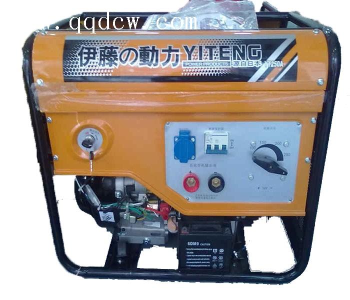伊藤YT250A汽油发电电焊一体机此款焊机适合长期连续焊5.0以内的焊条(包括5.0) 联系工作时间 20小时 直流焊机 适合管道施工 野外施工等 可以同时进行电焊机,照明,发电,碱性焊条,506 507 4.0 3.2焊条,不锈钢焊条 各种普通焊条。多功能发电电焊机。 技术参数:带走行轮,便于移动,适合野外作业。产品编号:YT250A 汽油发电电焊机一体空载电压:65V工作电压:22-30V发动机功率 16HP发电电焊机功率 7.5KW 电流调节范围:80-250A负载持续率:100%辅助电源电压:230V辅助电源功率:2KW机油警告系统:有冷却方式:风冷气门形式:OHV排气量:420L点火系统:无触点晶体管点火 邮箱容量:20L启动方式:手启动连续工作时间 15小时重量: 75KG此款发电焊机75KG 适用于户外钢结构施工 无需链接固定电源 随时随地都可进行电焊 发电电焊机,有汽油和柴油两款,各有其优点,电流有直流和交流,是发电机和电焊机连体的设备,一款新的焊机设备,且附带2千瓦的辅助电源,可以是电焊作业的同时进行其他照明灯工作。