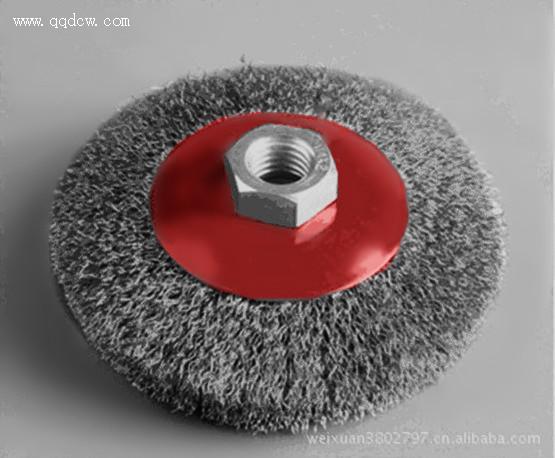 电池打磨-碟型(红碗)钢丝轮产品参数:外径100-125mm,螺母M14x2、M10x1.5,材质304#不锈钢丝,丝径0.15-0.2mm。